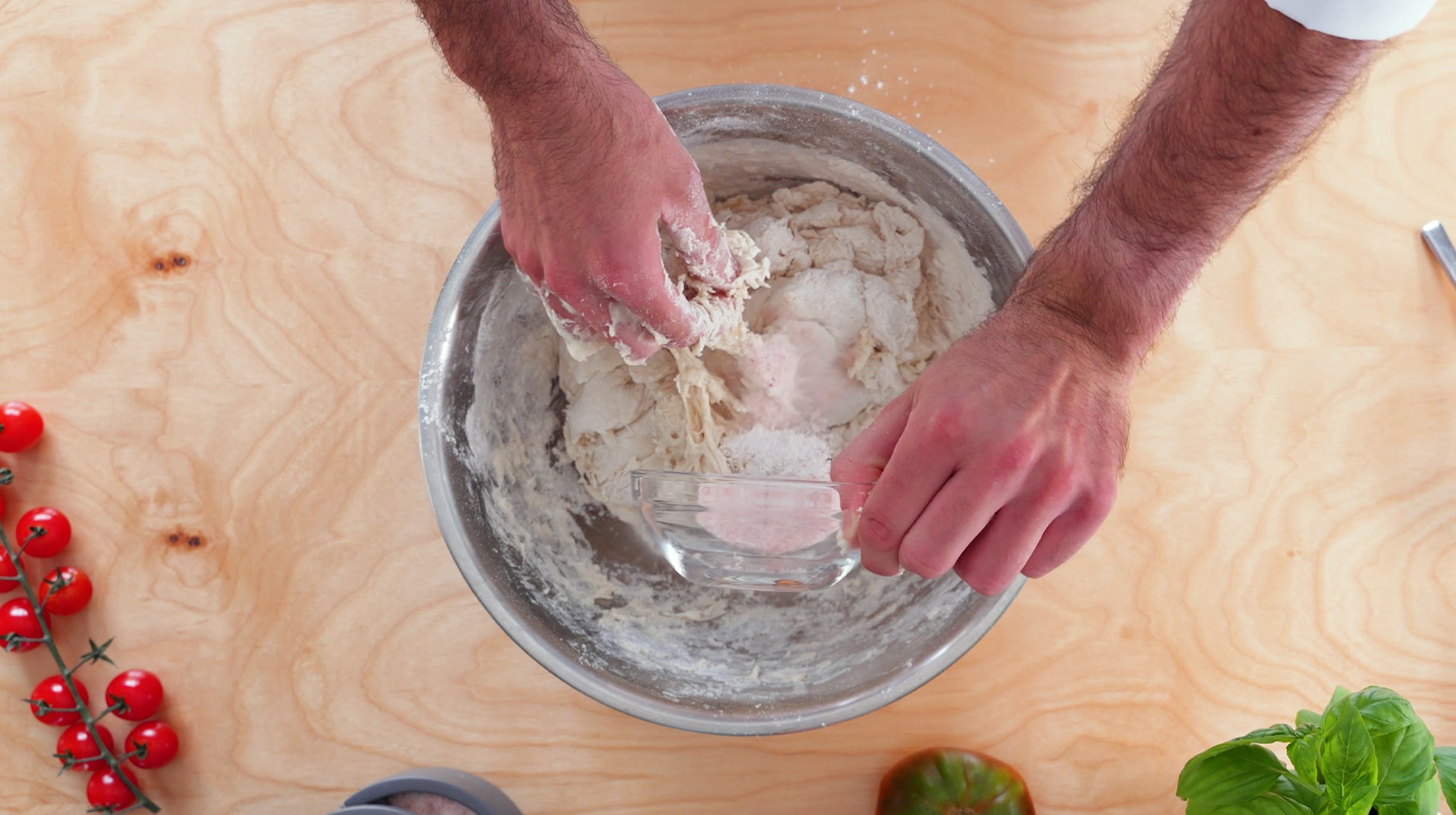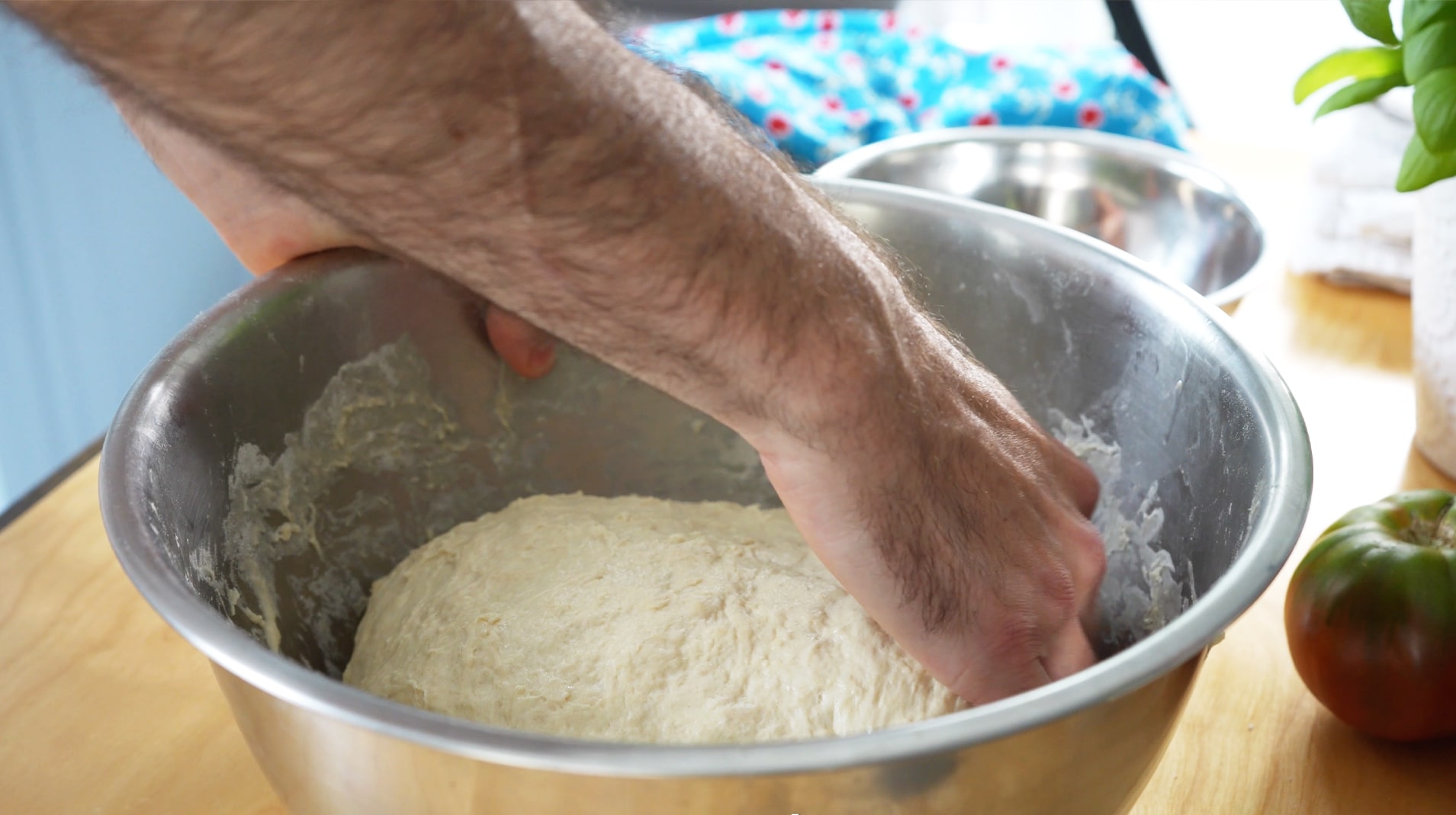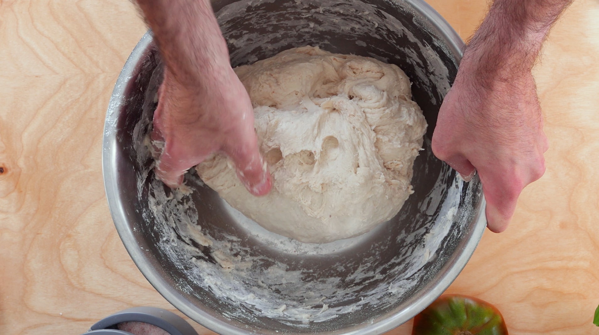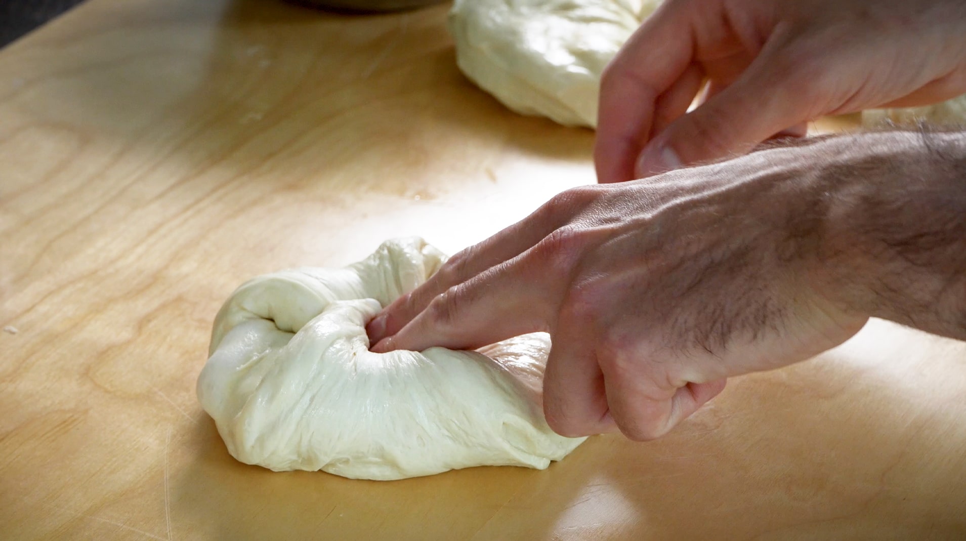 Once rested, transfer the dough to your work surface, cup your hands and pull the dough towards you. Do this about four times and you will see the gluten begin to tighten and the ball is shaping itself.