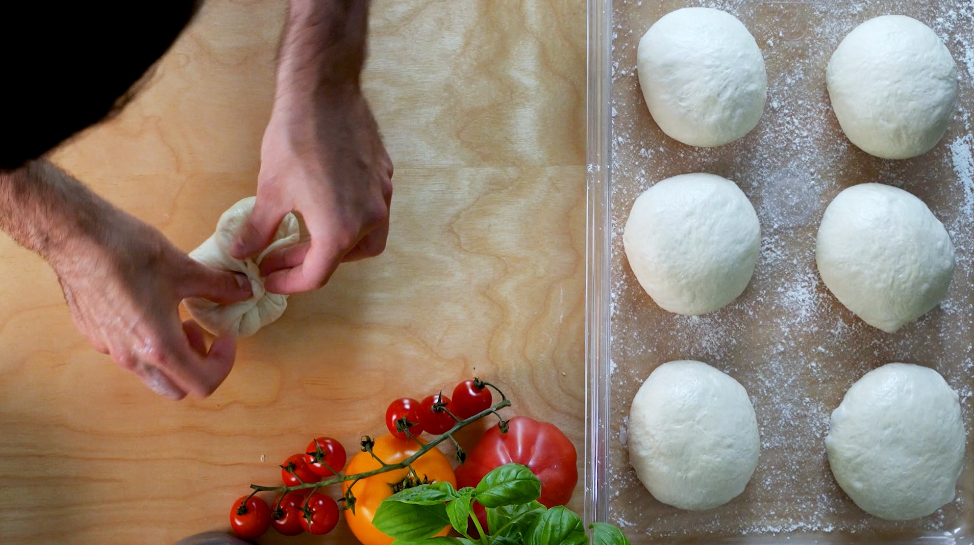Once you have weighed your dough, you will start to make individual dough balls. The way you do this is fold in all sides of the dough. Repeat this process until you can see the gluten start to tighten. Make sure the bottom of the balls are pinched and closed tightly.