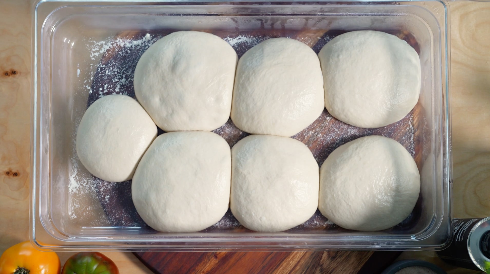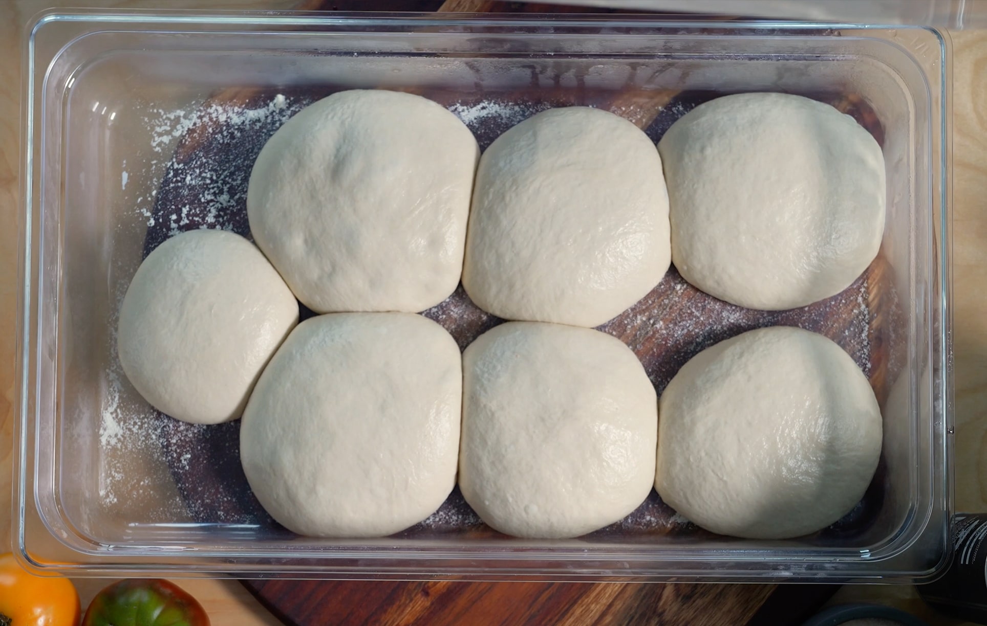 Transfer the prepared dough balls to a pizza dough box dusted with Semolina Flour on the bottom or inside a lightly oiled container.