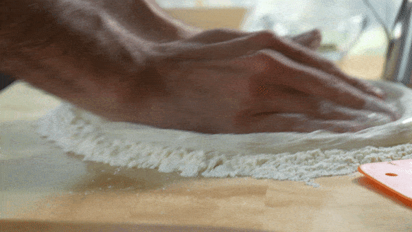 When the dough is ready, with damp fingertips gently remove it from the sides and bottom of your bowl. Carefully begin to fold the sides of the dough in and over.