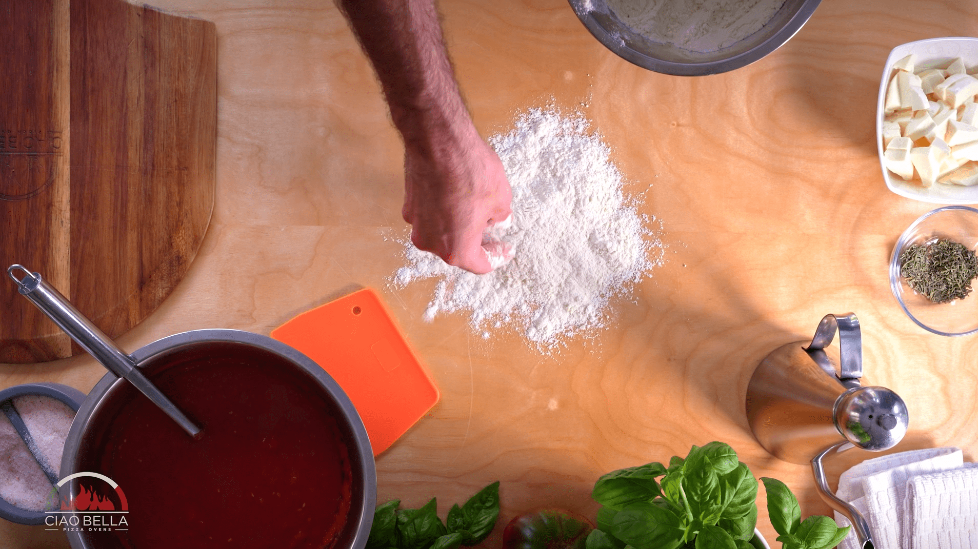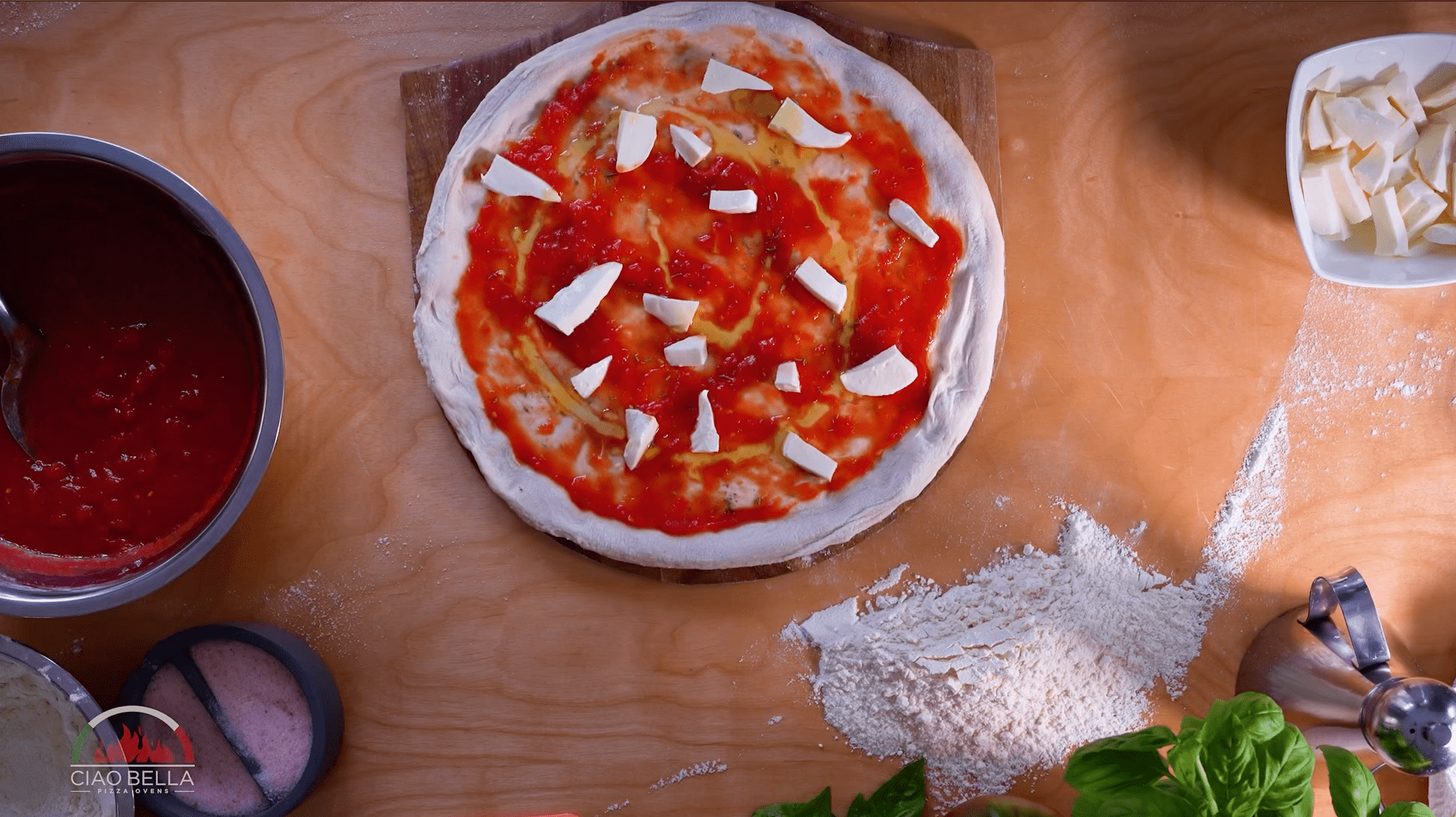 Top with San Marzano Tomato Sauce, followed by chopped oregano, the Fior di Latte Mozzarella, and finish with Extra Virgin Olive Oil, spreading both evenly on the dough and leaving room for the crust (about a ½ inch).