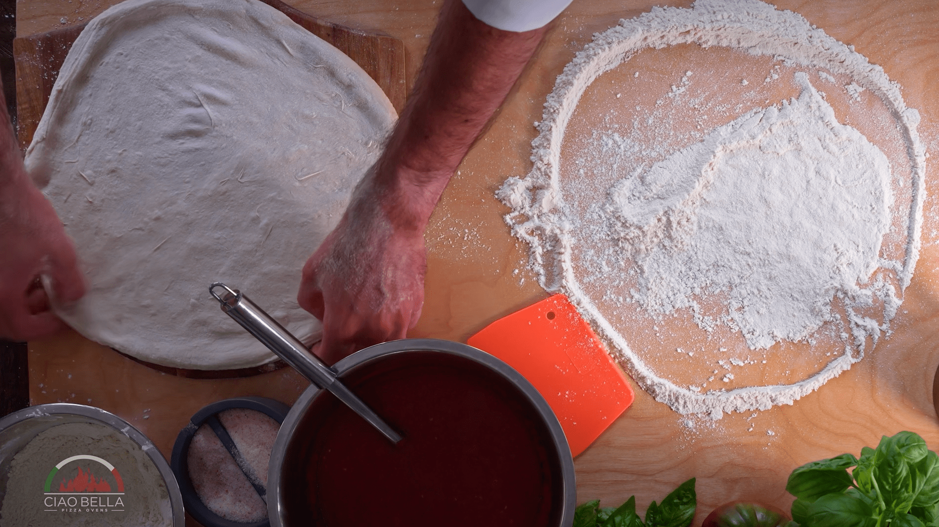 Using a small amount of flour, dust your work surface and your wood pizza peel.