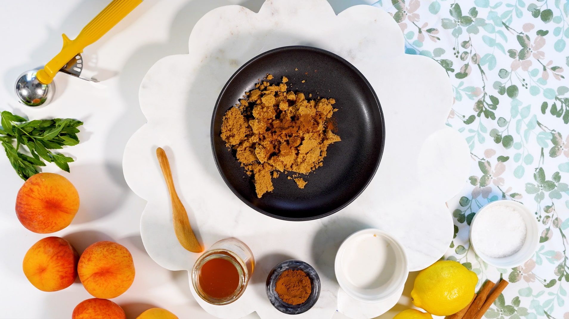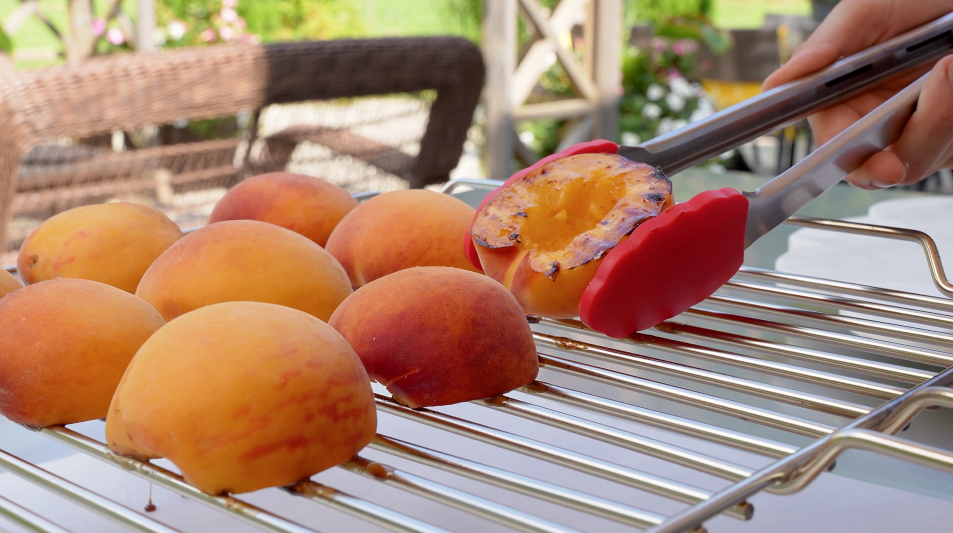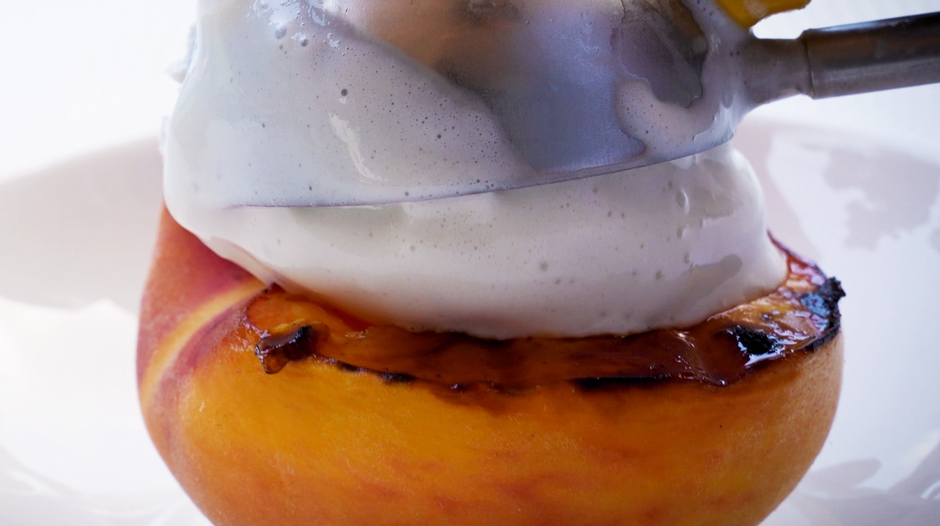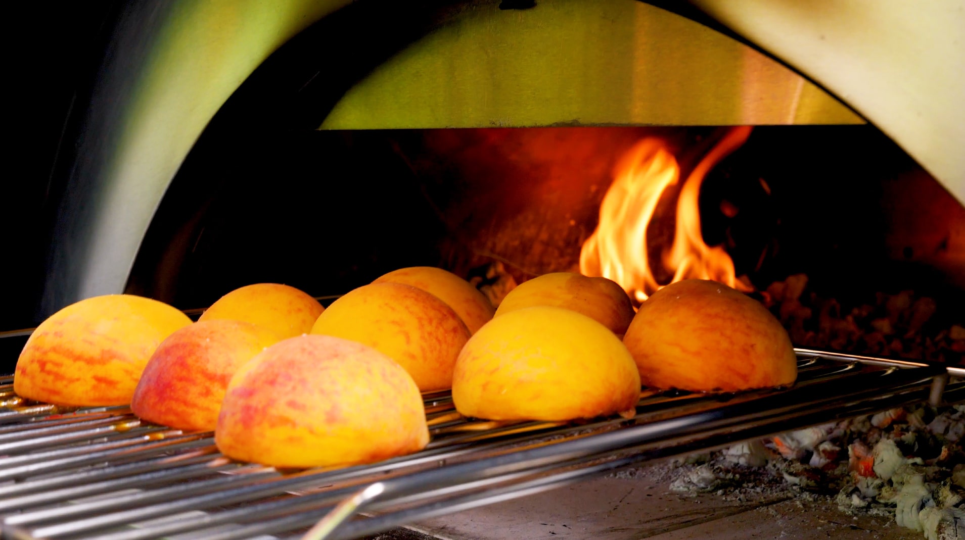 Grill the peach halves inside the oven on top of hot charcoal at 600/650°F for 3 to 5 minutes, or until caramelized. The grill must be very hot to prevent the peaches from sticking.