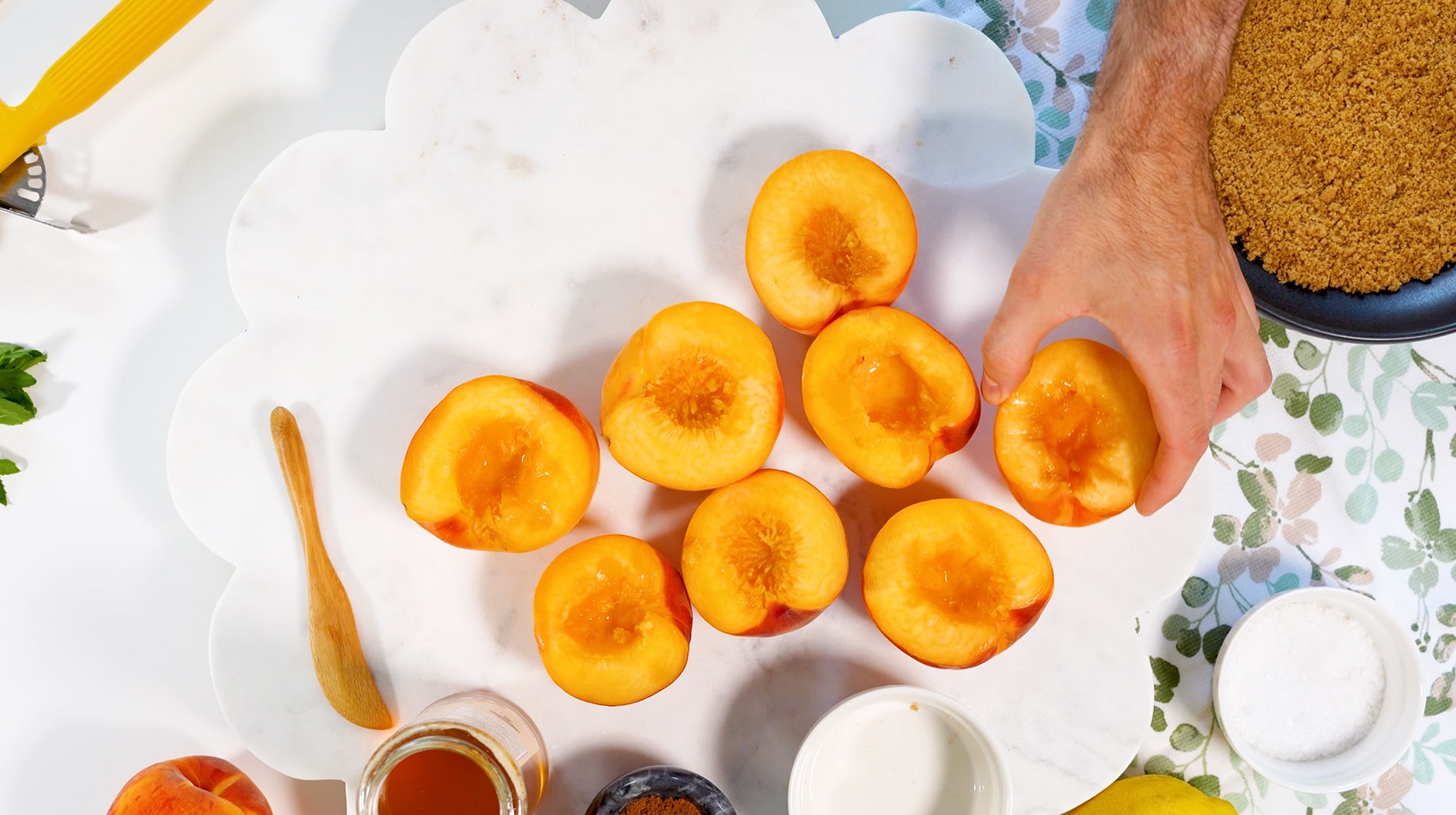 Split the peaches in half, and remove the pits. No need to peel the skins! They will soften up just fine when you cook the baked peaches in the oven.