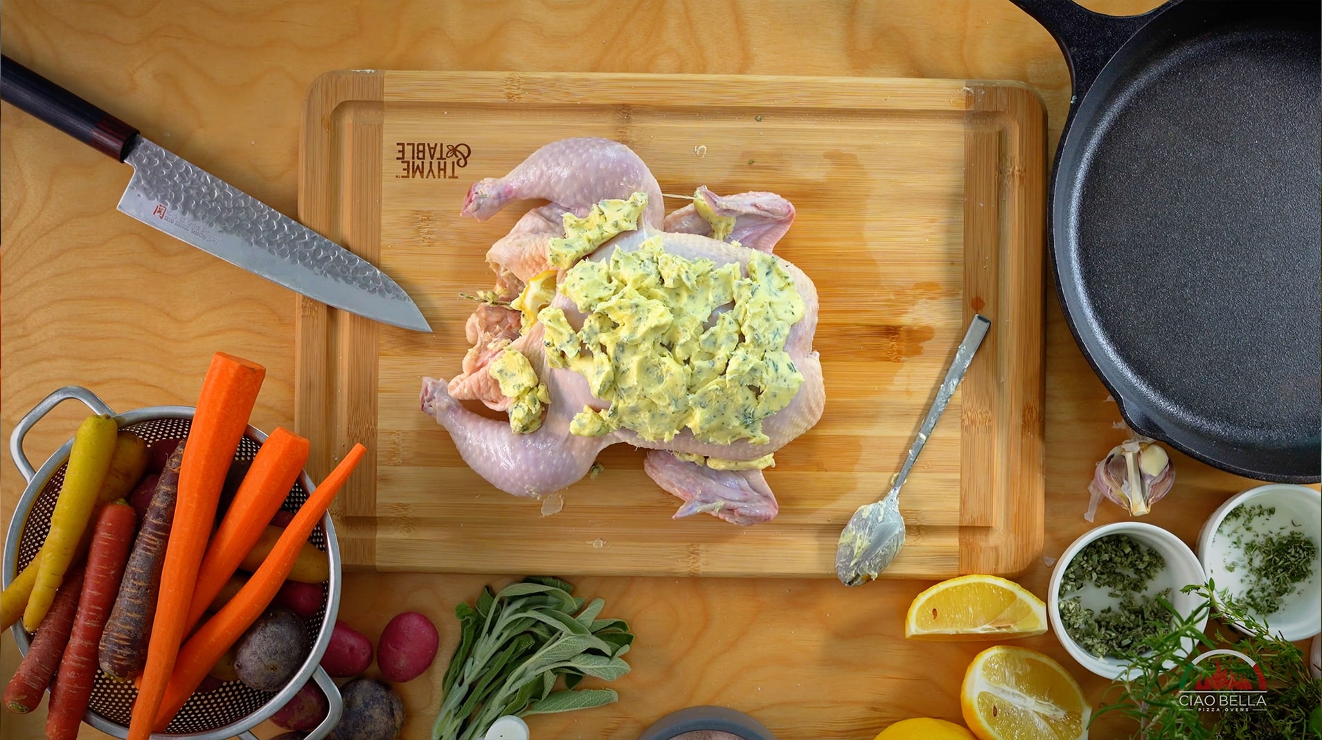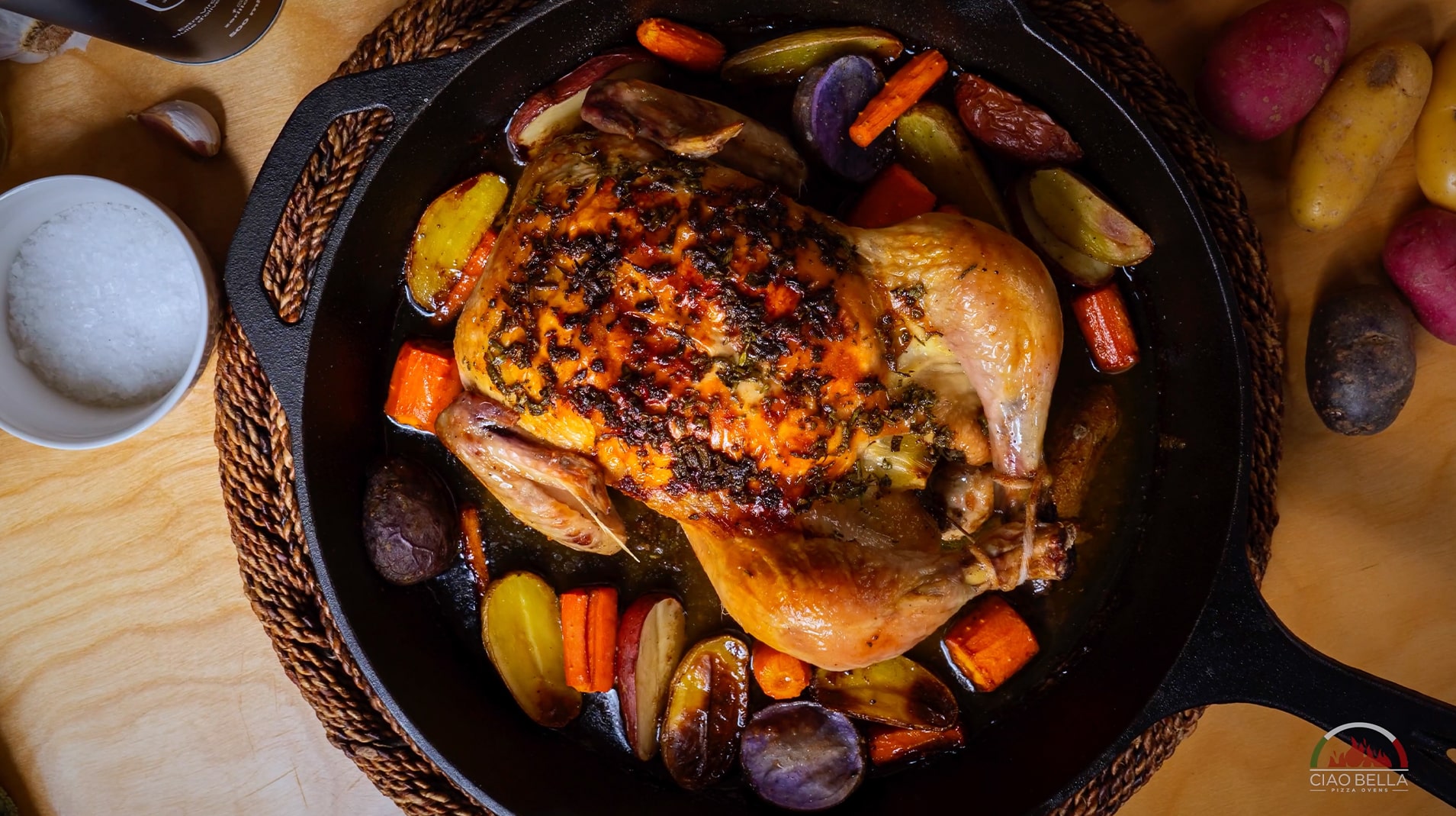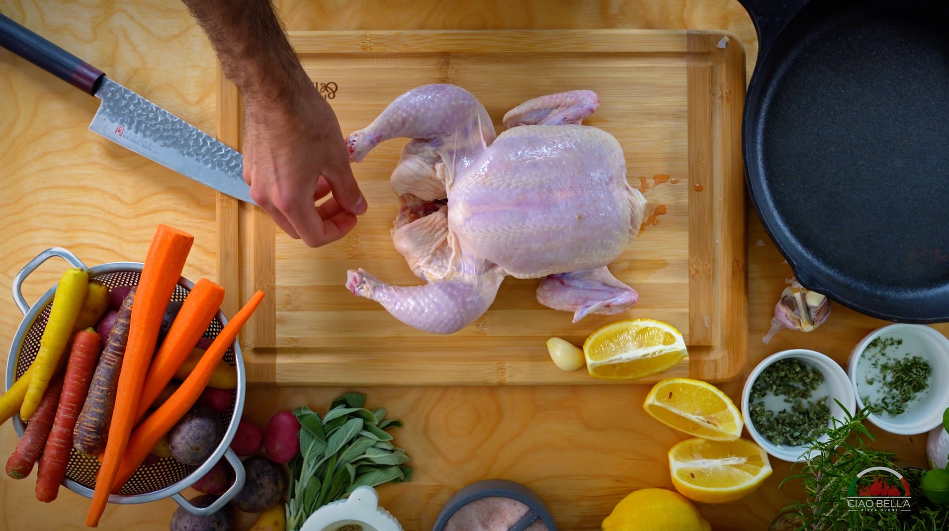Place the chicken breast side up in a Ciao Bella Pre-Seasoned Cast Iron Skillet Pan.