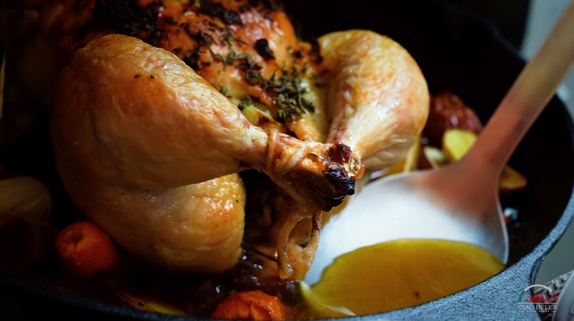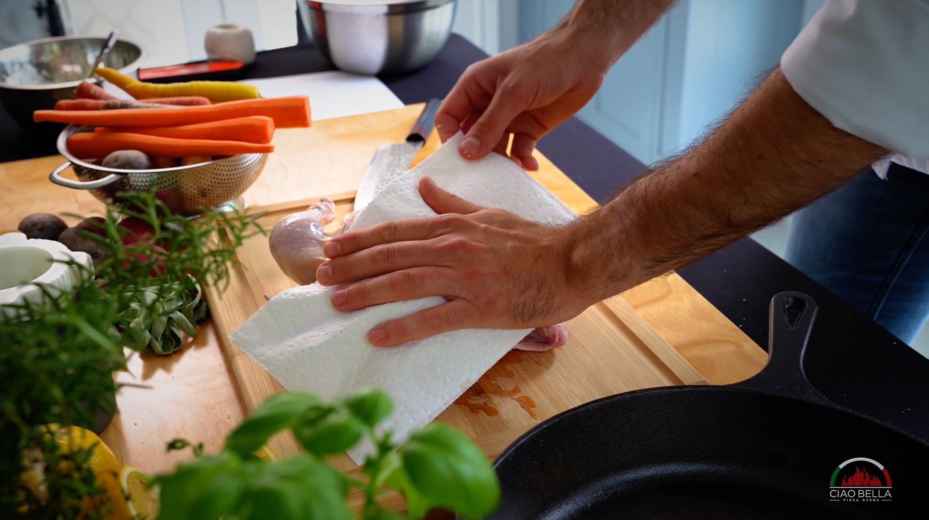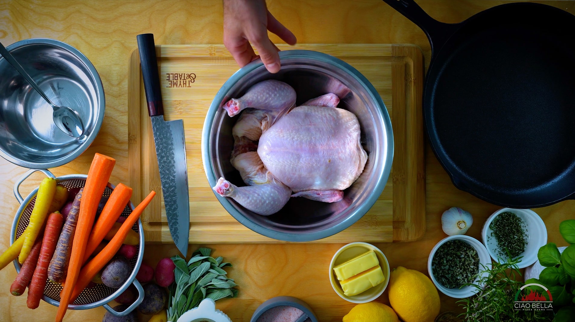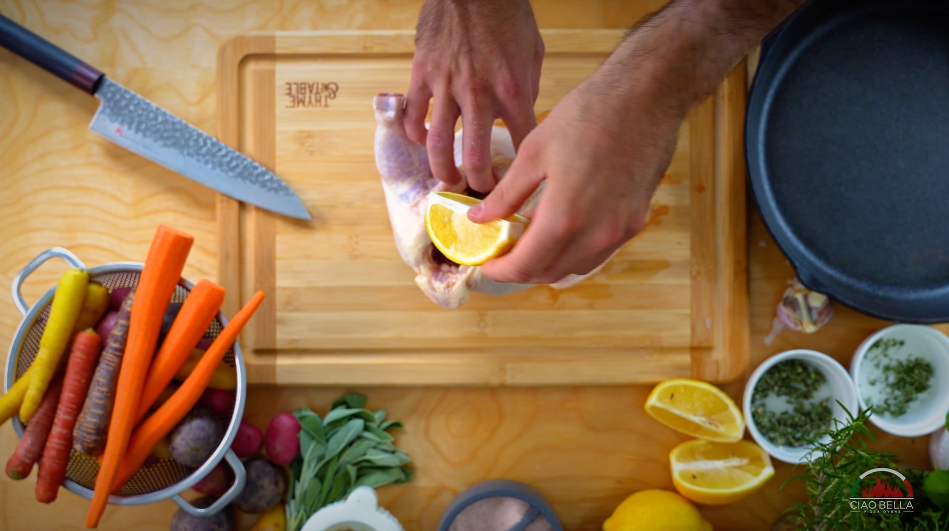 Place the chicken breast side up in a Ciao Bella Pre-Seasoned Cast Iron Skillet Pan.