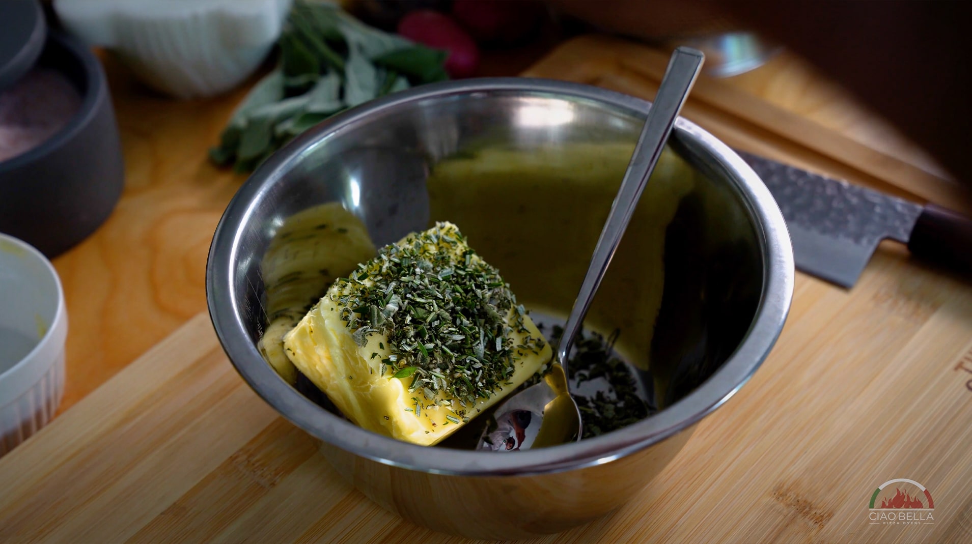 To start, mix the room temperature butter in a bowl with the chopped sage, rosemary, thyme, salt, and black pepper. Once everything is mixed together, set aside.