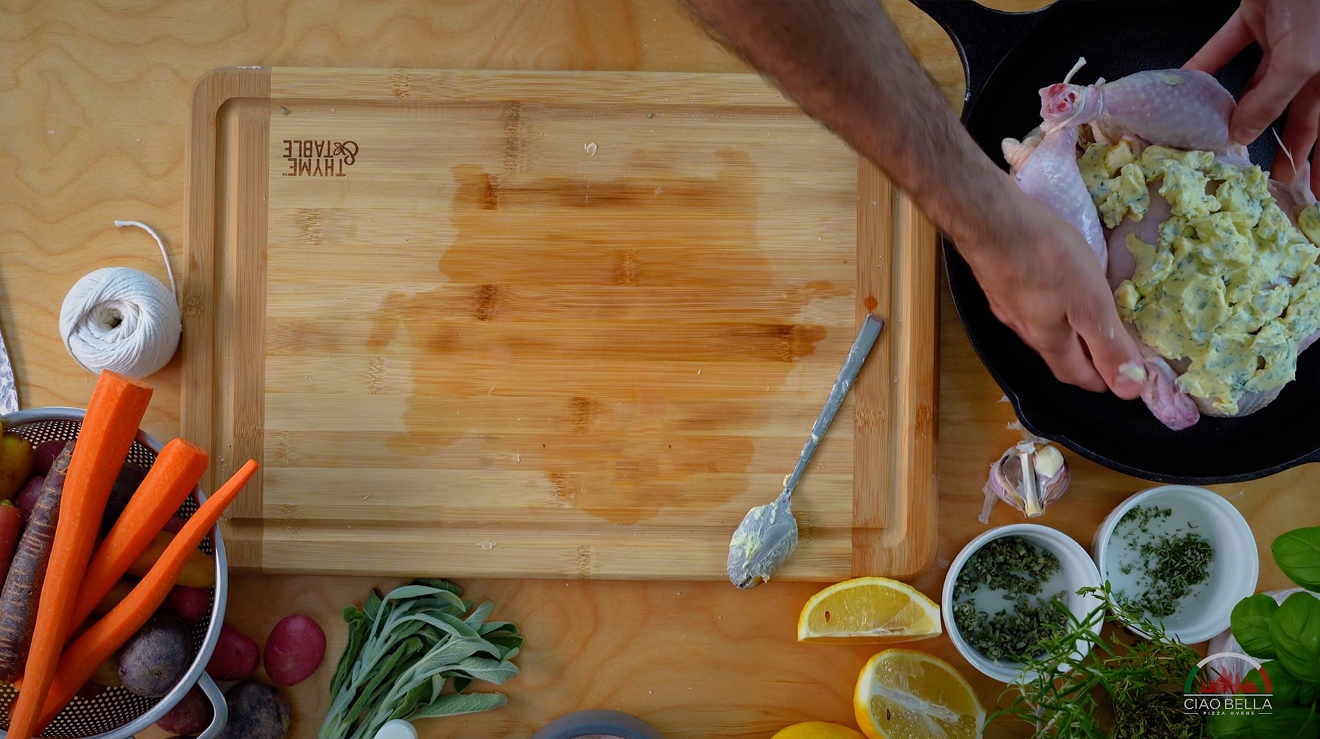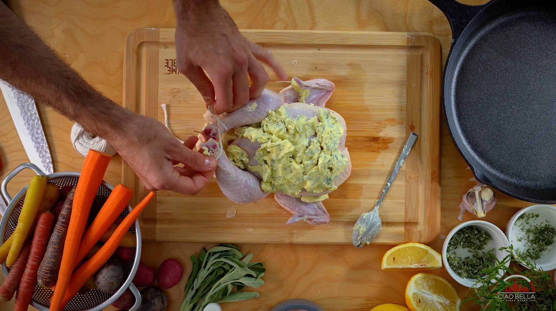 Spread the herb butter mixture over the skin of the chicken. If you would like, half of the herbed butter can be placed inside the cavity of the chicken to infuse the butter into the meat.