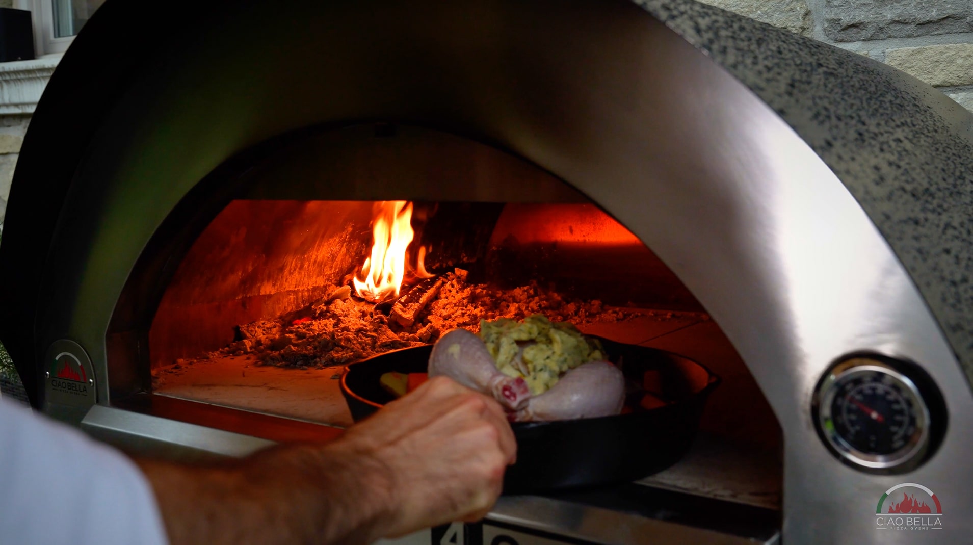 Cook the chicken inside your Ciao Bella Pizza Oven for 1 hour. Make sure to check occasionally that you still have a large flame.